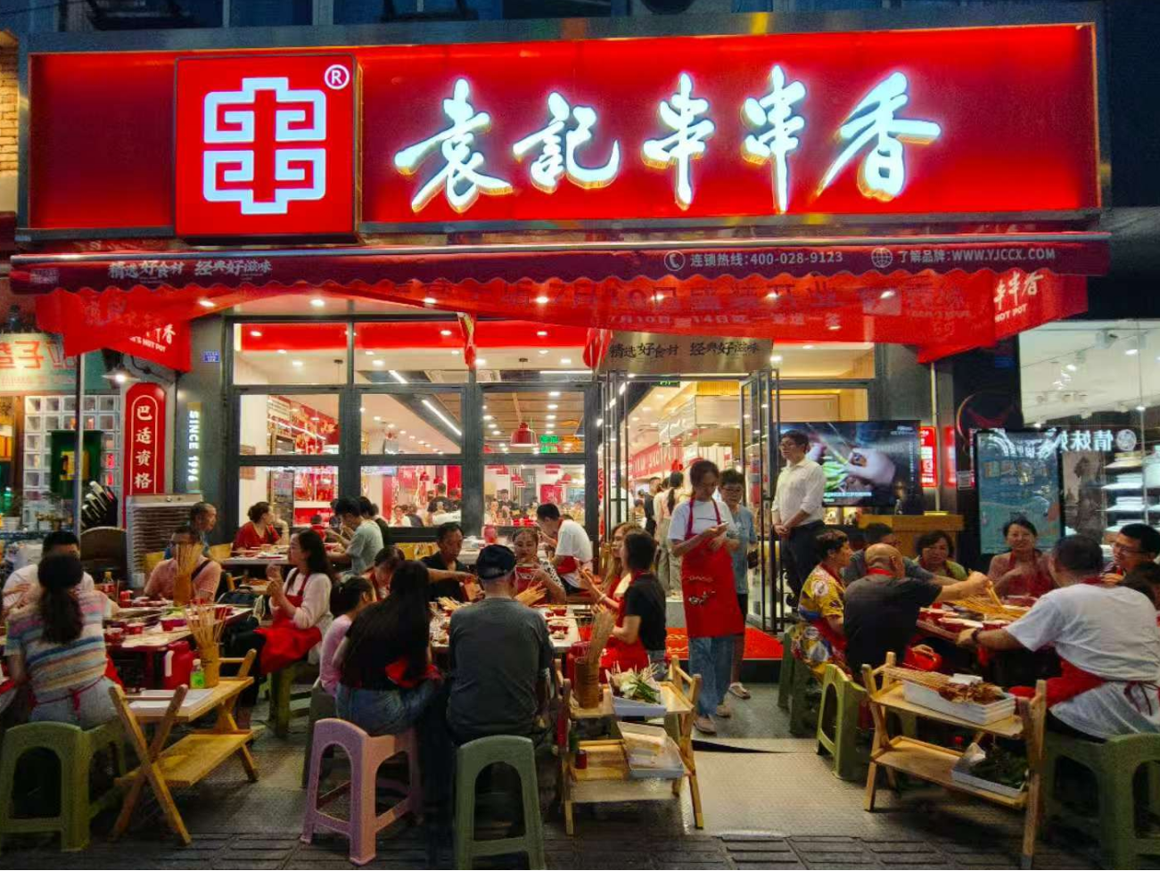 分店上了一定规模 袁记串串香开始了品牌化管理 以及标准化建设 那时候串串香品牌化运作还属破天荒第一遭 袁记创始人全靠一支笔、一个笔记本 在书店里手抄管理书籍 回家融会贯通,消化了再培训员工 第一批员工都是懵懂的 他们来自各个乡村和农舍 因为没文凭没背景 才来干包吃包住餐饮服务行业 他们初入袁记听着袁记创始人的课 恍惚间最清楚的一句 是创始人说: 别看今天我们开在这条街上 未来大街小巷、大江南北、大洋彼端 都会有袁记串串香 1999年,他们信了 成都大街小巷都是袁记串串香 2000年,袁记开始在省外发展 设立昆明分公司和昆明总店 2001年,省外第一家加盟店 在青海西宁诞生了 2016年,袁记历史性的的走出国门 开设直营温哥华时代坊店